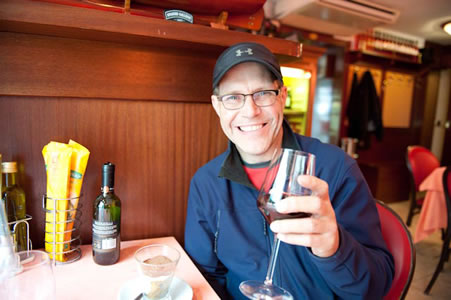 Our own fingers grew cold as walked Venice, but the exercise worked well to keep us awake. I purchased a pair of reasonably-priced long blue gloves and Jim asked to borrow one. That left us each with one warm hand and one hand available for photos (Jim) and guidebook (me.) Jim looks pretty cute in his woman’s glove with the bunched up cashmere sleeve. Jim forgot his I-pod so we shared mine as we listened to a Rick Steves walking tour. Our glove and I-pod sharing worked beautifully. As I write this, Jim is wearing my slippers. I am little concerned what he‘ll wear of mine next.