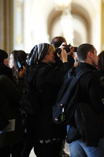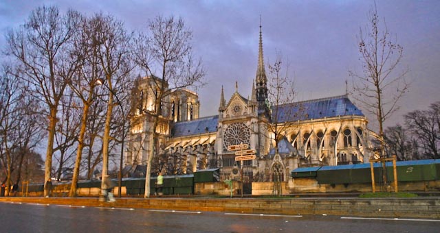We approach Notre Dame and notice giant scaffolding for overflow outdoor seating. A huge screen telecasts the Mass happening inside for the shivering worshipers outside. They’re celebrating the 850th anniversary of the church. Lines of the faithful begin streaming indoors, not for a seat, but to receive communion.