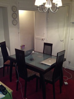We settled in while waiting for Robert’s return. Let me describe this apartment for you. The humble foyer leads up a windy scuffed circular stairway to our 4th floor. You enter the dining room, which contains no fewer than six doors: terrace, closet, front door, bedroom, toilet room, and kitchen. It’s like Alice in Wonderland in here.