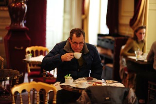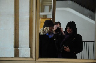 Out on the covered but unheated sidewalk terrace, female students from the Sorbonne sit and chat and smoke in the freezing temperatures. Jim comments on the power of addiction. We observe one gal on the other side of the glass meticulously rolling her own cigarette. Eventually some young women finish their smokes and sneak inside for warmth.