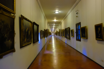 Our guide admits us to the Vasari Corridor through an unmarked door on the top floor of the Uffizi Gallery. We descend roughly three flights and around a few bends before reaching the bridge section of the passageway.
