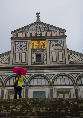 Up we scale, periodically stopping to catch our breath. I’d forgotten about the tight cupola space at top. Mother Nature screams here and we open our umbrellas. I worry that my umbrella will fly from my hand, missile-like, onto vulnerable pedestrians below.