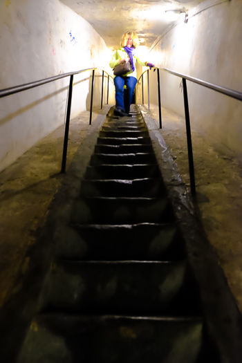 On our trek down, we re-round the interior dome. Signs in multiple languages admonish visitors to “keep moving.” A visitor hesitating even a moment in this narrow space would gum up the entire traffic flow. Happily, we have the entire passage to ourselves.