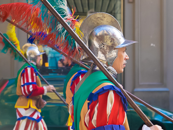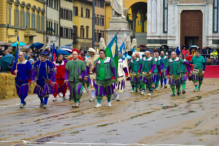 Team captains bear bright banners and wear elaborate Renaissance jackets. The players, many with pasta-indulged guts, sport flared, striped pantaloons.