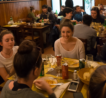 For today’s lunch we visit a small family-run restaurant around the corner from our apartment. We score the spacious back room nearly to ourselves while a couple of waiters lounge in the front room, nursing espressos. I’m about to comment to Jim about the peaceful environment when 25 Bostonian high schoolers and teachers swarm the place, enveloping us. The teens order beer and carafes of red and white wine. Minors can order minor alcohol at age 16 but must wait until 18 to order harder stuff. We’re in Italy.