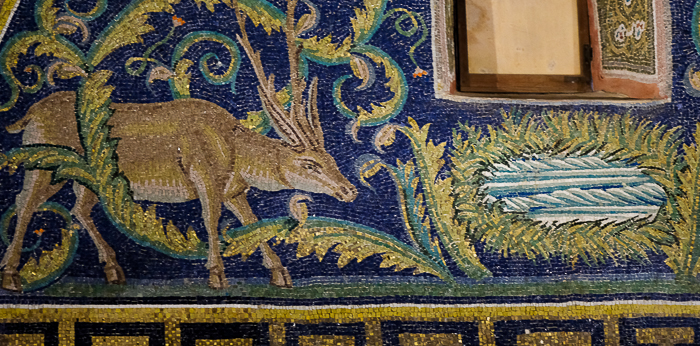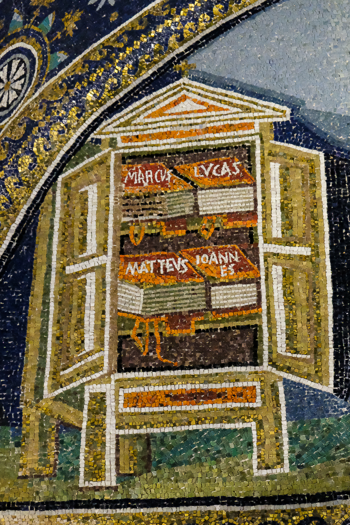 In the 450 AD Mausoleum of Galla Placidia, a mosaic illustrates four colorful volumes on a bookshelf--the Gospels of Matthew, Mark, Luke and John. Deer sip water in tribute to Psalm 42: As the deer pants for water, so I long for you, O God.