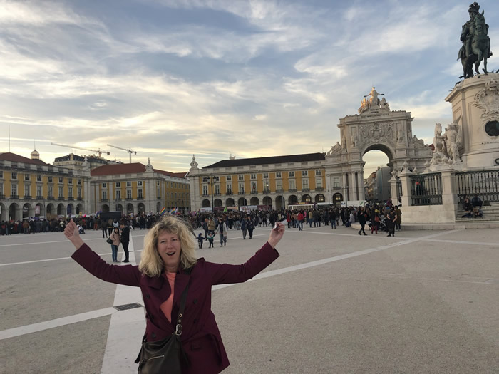 We walked to the nearby Placa do Comercio square where some type of gathering swelled. Usually when we travel, Jim bolts as far as possible from any political demonstration. But this seemed like an upbeat group comprised mainly of women, so he was okay with further investigation. Or possibly he was just pleased I’d decided to join him out after dinner, I don’t know.