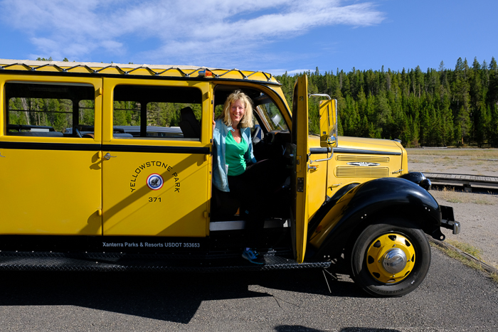 We booked a riding tour on a yellow Jammer bus built in 1938, similar to the one my grandfather drove at Yellowstone in the early 1920s. Despite the 12-seater being fully booked, nobody showed up but us and Driver Laura (not to be confused with Ranger Laura). Laura explained that foreign package deals for Yellowstone often include the bus ride but guests sometimes don’t realize it. Or maybe they’re just too jet-lagged, she concluded.