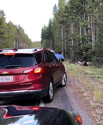 Ten minutes later a red car in front of us stopped suddenly; one vehicle beyond them, a mama grizzly and her pair of cubs sauntered across the highway. Two women hopped from the red car, camera-ready, and inched toward the bears. A guy behind us walked next to our truck while we commented on the danger. I think he heard us, because he flashed a micro-expression, something between awareness and terror, before high-tailing back to his car. I rolled up my window and held my breath as we watched the bears recede into the woods.