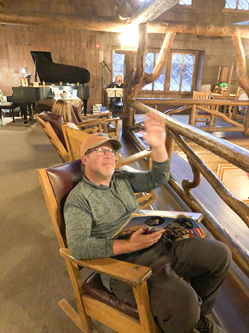 I texted one such photo and description of Jim lounging in this cathedral-like lobby of Old Faithful Inn, him scanning a magazine while listening to a middle-aged female vocalist/viola player doing an admirable rendition of Prince’s “Purple Rain.” Not something you see everyday.