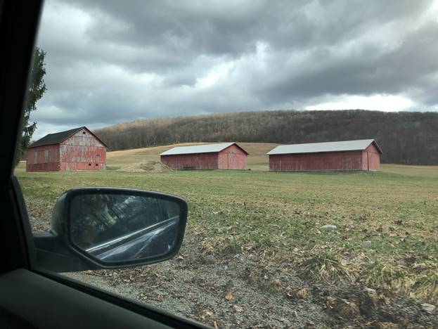 The turnpike slices through mountains with familiar names like Allegheny and other strangely-named ones I can’t remember, all in tunnels of incredible length. Their narrowness and repeated lights made Jim dizzy and disoriented. At one point he realized he’d been holding his breath, never helpful for a driver.